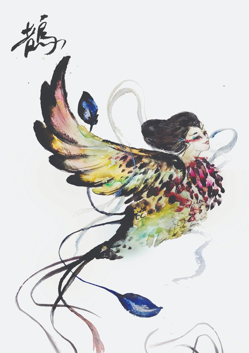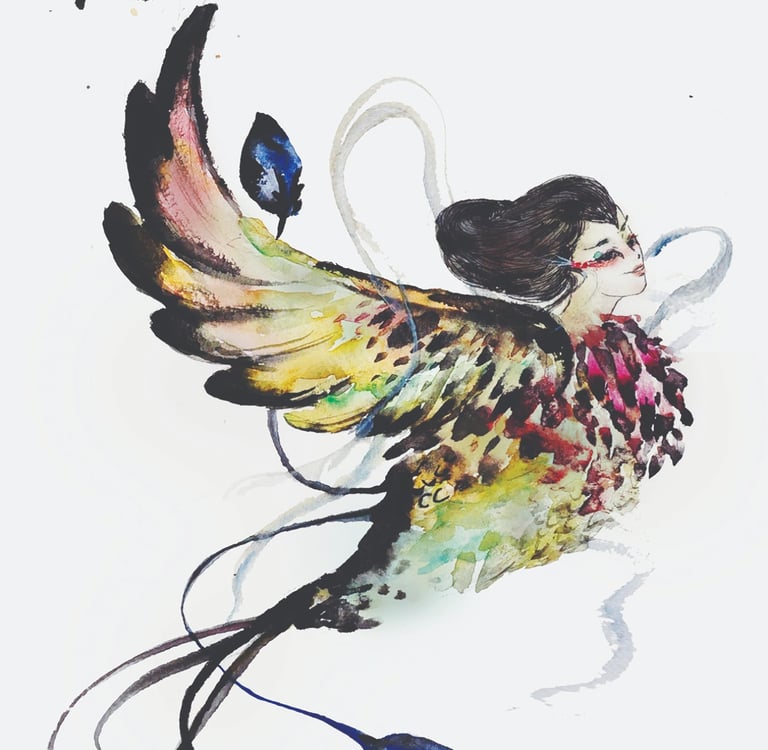 Delicate ink lines and soft wings that tell a story about a person turning into a bird.