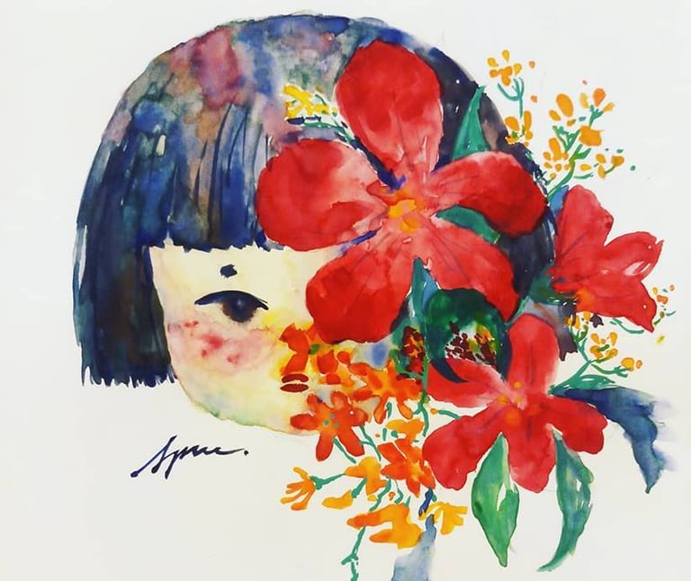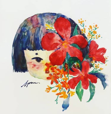 Bold red flowers and blue hair showing how the beauty of nature can hide and protect us.